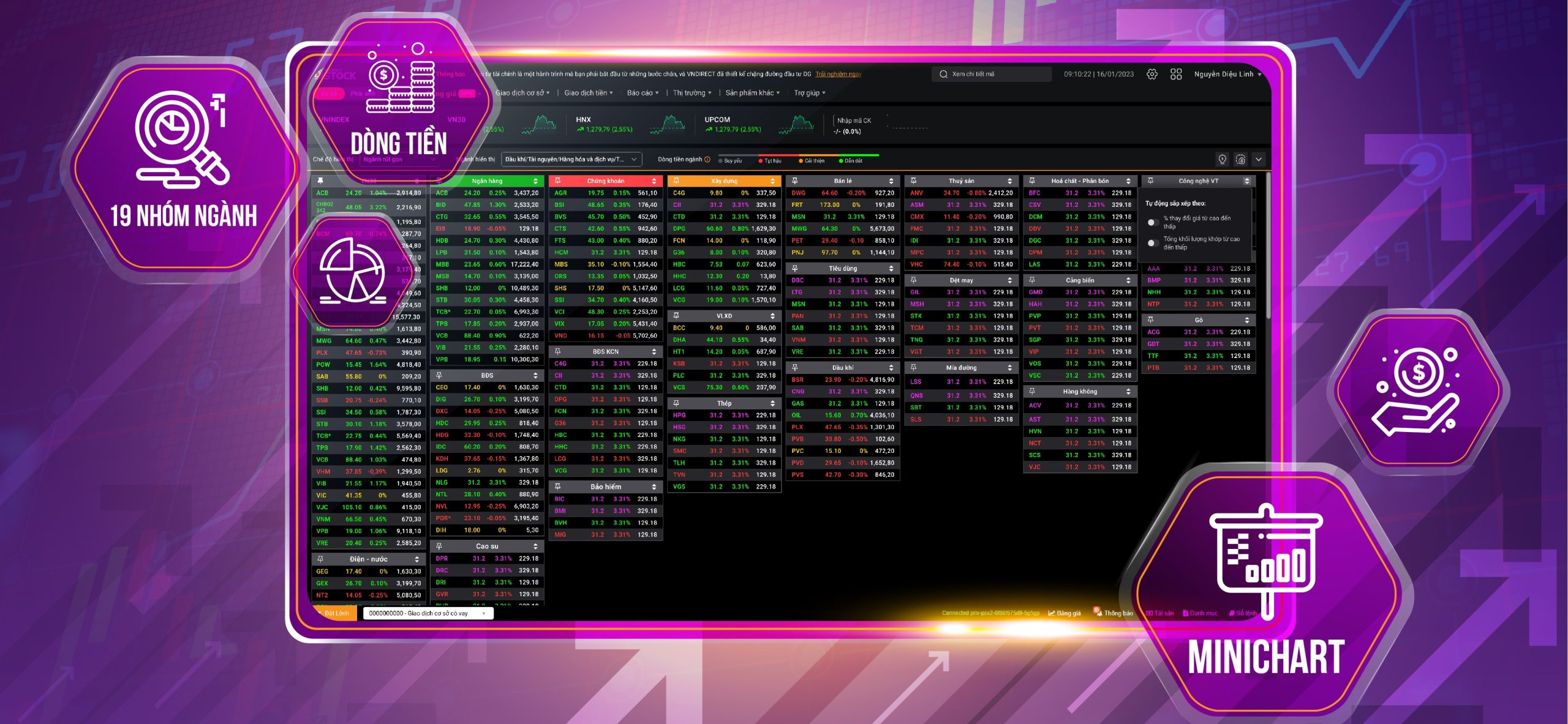 Với định vị “Trí tuệ công nghệ – giao dịch nhà nghề”, hiện nay VNDIRECT đã ra mắt bảng giá mini tích hợp ngay trên bảng giá chứng khoán giao dịch nhà nghề của VNDIRECT, giúp nhà đầu tư theo dõi 19 ngành lớn cùng một lúc và trên cùng một giao diện, tiết kiệm thời gian tạo danh mục mà còn có góc nhìn toàn cảnh diễn biến dòng tiền của các ngành nhanh chóng.