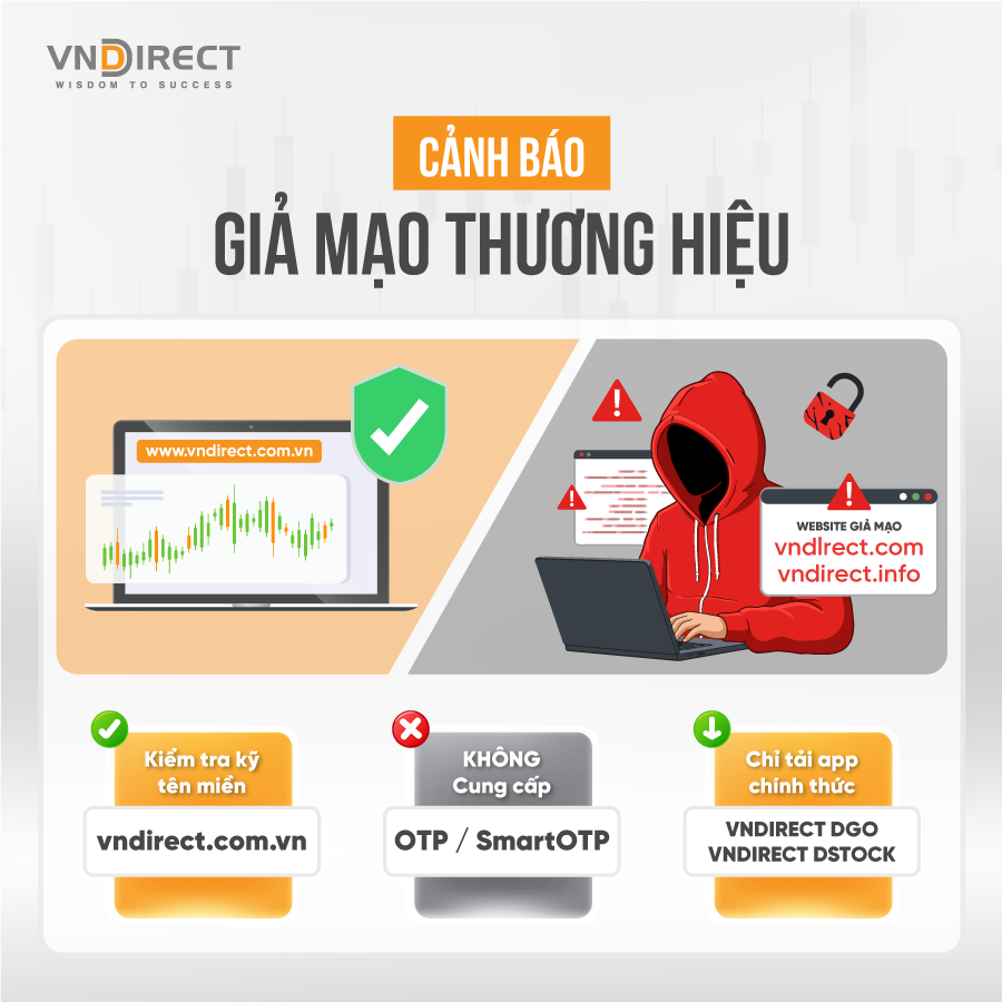 VNDIRECT nhấn mạnh đơn vị không bao giờ yêu cầu khách hàng cung cấp mật khẩu, OTP hoặc SmartOTP qua điện thoại, email hay các đường link không xác thực. Mọi yêu cầu liên quan đến thông tin bảo mật dưới bất kỳ hình thức nào đều cần được kiểm tra và xác minh kỹ lưỡng.