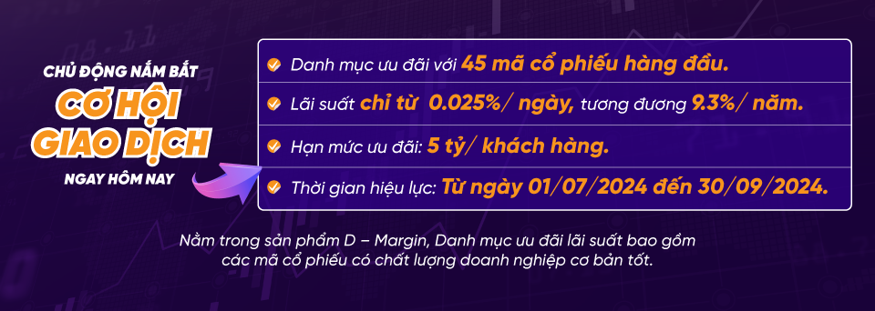 - Với những mã cổ phiếu nằm ngoài danh mục ưu đãi, mức lãi suất được áp dụng theo lãi suất D-Margin hiện hành.