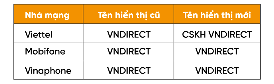Kể từ ngày 01/10/2024, theo quy định của nhà mạng VIETTEL, tên hiển thị cuộc gọi thương hiệu từ VNDIRECT sẽ có sự thay đổi đối với Khách hàng đang sở hữu thuê bao VIETTEL. Với Khách hàng sử dụng mạng Mobifone và Vinaphone, cuộc gọi vẫn hiển thị “VNDIRECT’’. Cụ thể: