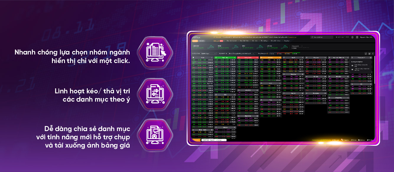 Hiểu được nhu cầu trên đồng thời với nỗ lực đem đến trải nghiệm giao dịch vượt trội và chuyên nghiệp, VNDIRECT tiên phong ra mắt Bảng giá Mini – Bảng giá đầu tiên trên thị trường cho phép quan sát diễn biến các nhóm ngành cổ phiếu trong cùng một thời điểm và dễ dàng cá nhân hóa bảng giá phù hợp với nhu cầu.